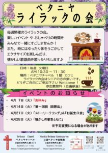 賛美やお祈り、聖書からのメッセージ 礼拝後は1Fカフェで楽しいティータイムがあります。