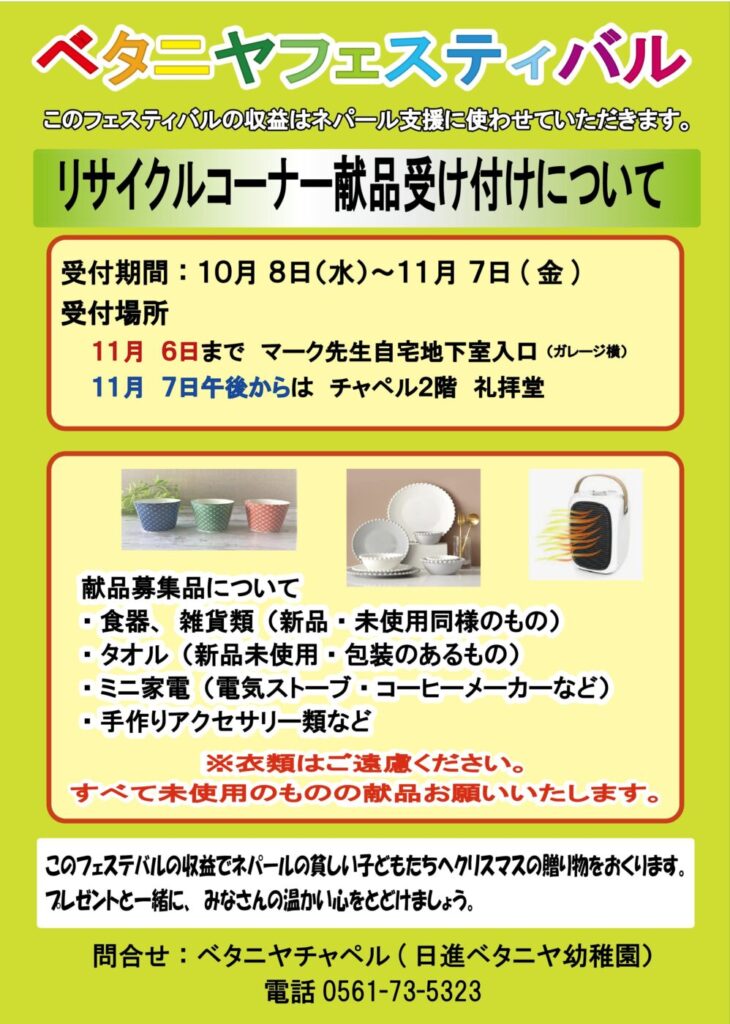 ベタニヤフェスティバルに先立ち、リサイクル品の献品を受付けてます。
