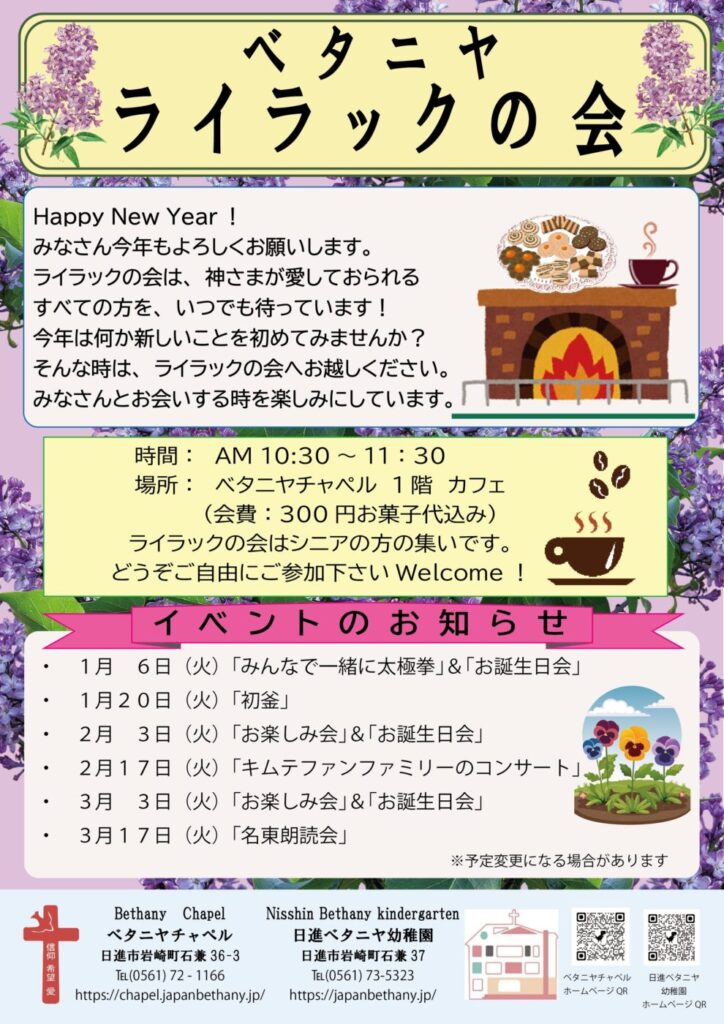 ライラックの会 2024年3月6日 最終更新日時 : 2025年12月25日 ベタニヤチャペル ライラックの会 ライラックの会はシニアの方のための集まりです。毎月2回、第1・第3火曜日にベタニヤチャペルに集まりコンサート鑑賞、ハンドクラフト、季節の催しなど楽しいイベントがいっぱいあります。 開催日:毎月、第1・第3火曜日 時間:10:30~11:30 会費:300円/回(お菓子代込) どなたでも参加して頂けます。どうぞ、開催日にチャペルへお越しください。お問合せもお待ちしております。 電話 0561-72-1166(ベタニヤチャペル) 0561-73-5323(日進ベタニヤ幼稚園)